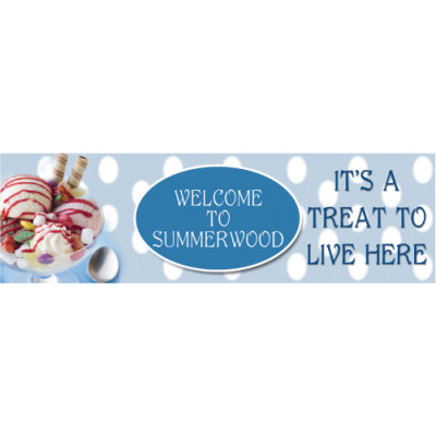 This banner is a treat. An ice cream sundae welcomes the traffic. The banner is digital print on 10 ounce vinyl. Customize as you wish.
