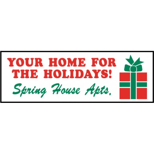 4' x 12' banner. Give a holiday gift to driveby traffic. A big Christmas present adorns our Your Home For The Holidays banner. With your property name.
